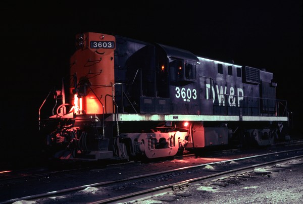 color corrected night photo of DW&P 3603 at White River Junction, VT.